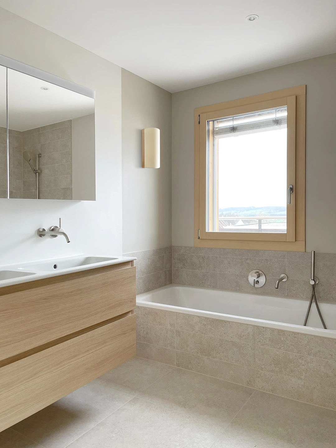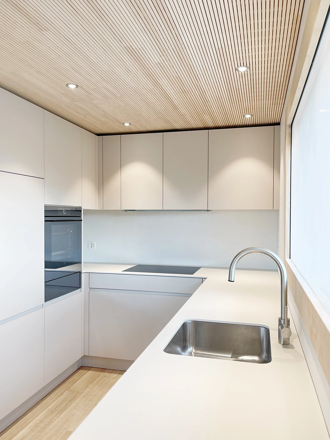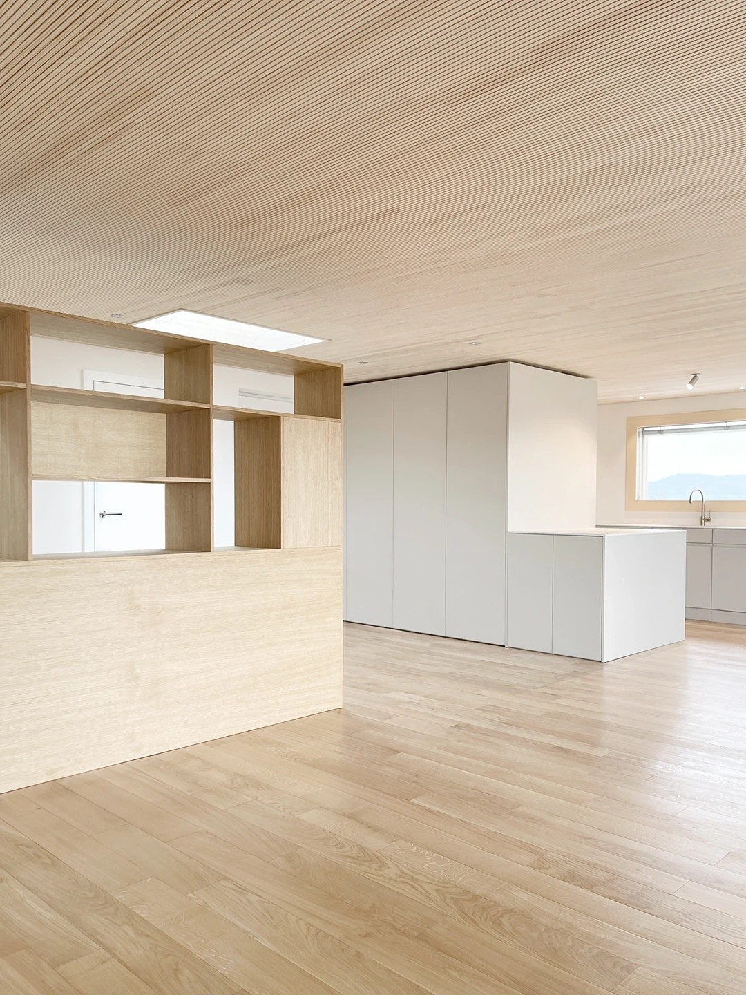 Bei der Aufstockung eines Mehrfamilienhauses in Hünenberg wurde eine 3.5-Zimmerwohnung als neues Zuhause für ein Seniorenpaar konzipiert. Die Gestaltung setzt auf warme Hölzer, feine Linien und sinnliche Grautöne. Ein Raumtrenner in heller Eiche zoniert den Wohnbereich und führt zum privaten Rückzugsort. Edelstahl-Armaturen und gezielte Lichtreflexe akzentuieren die ruhige Gesamtstimmung. Grundriss Materialkonzept Küche & Bäder Raumtrenner