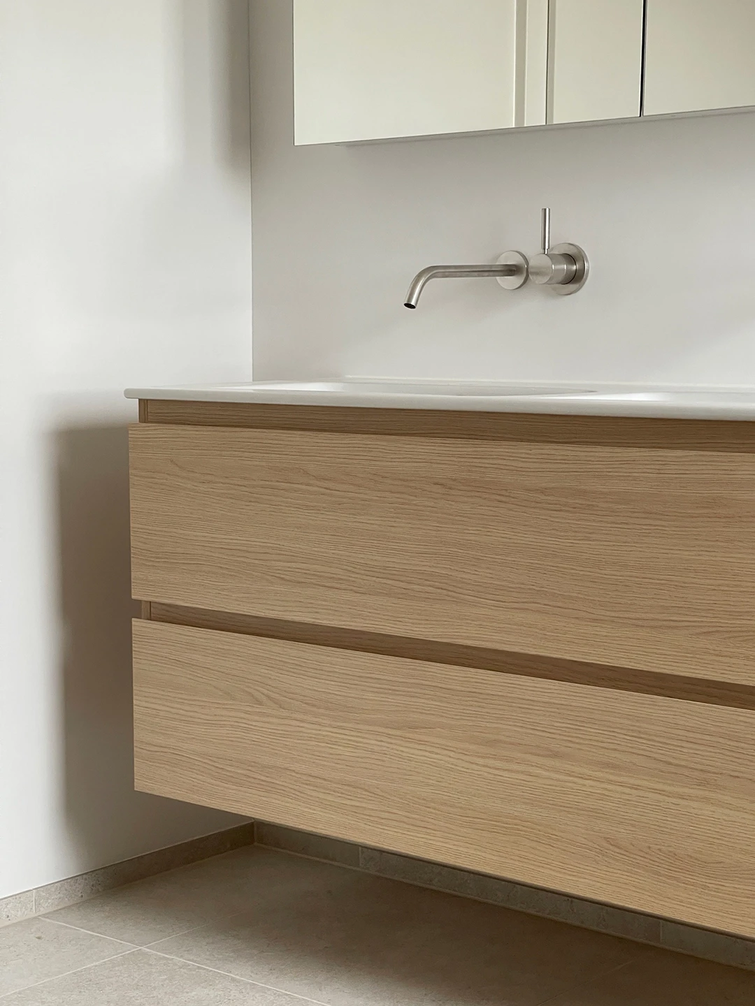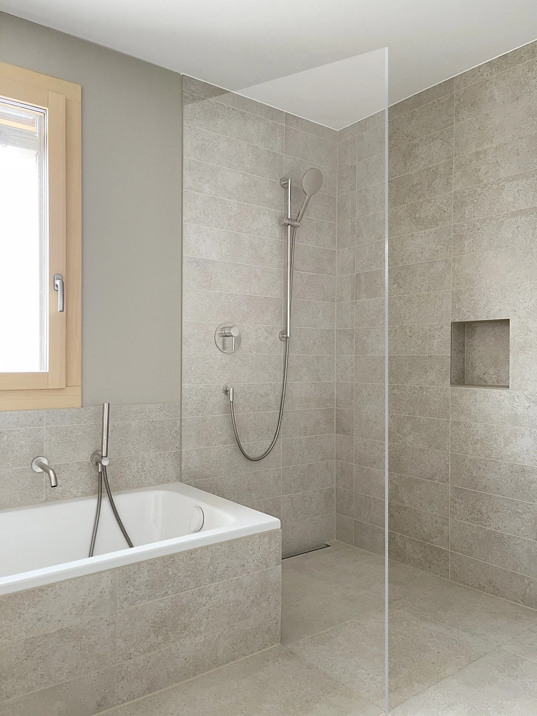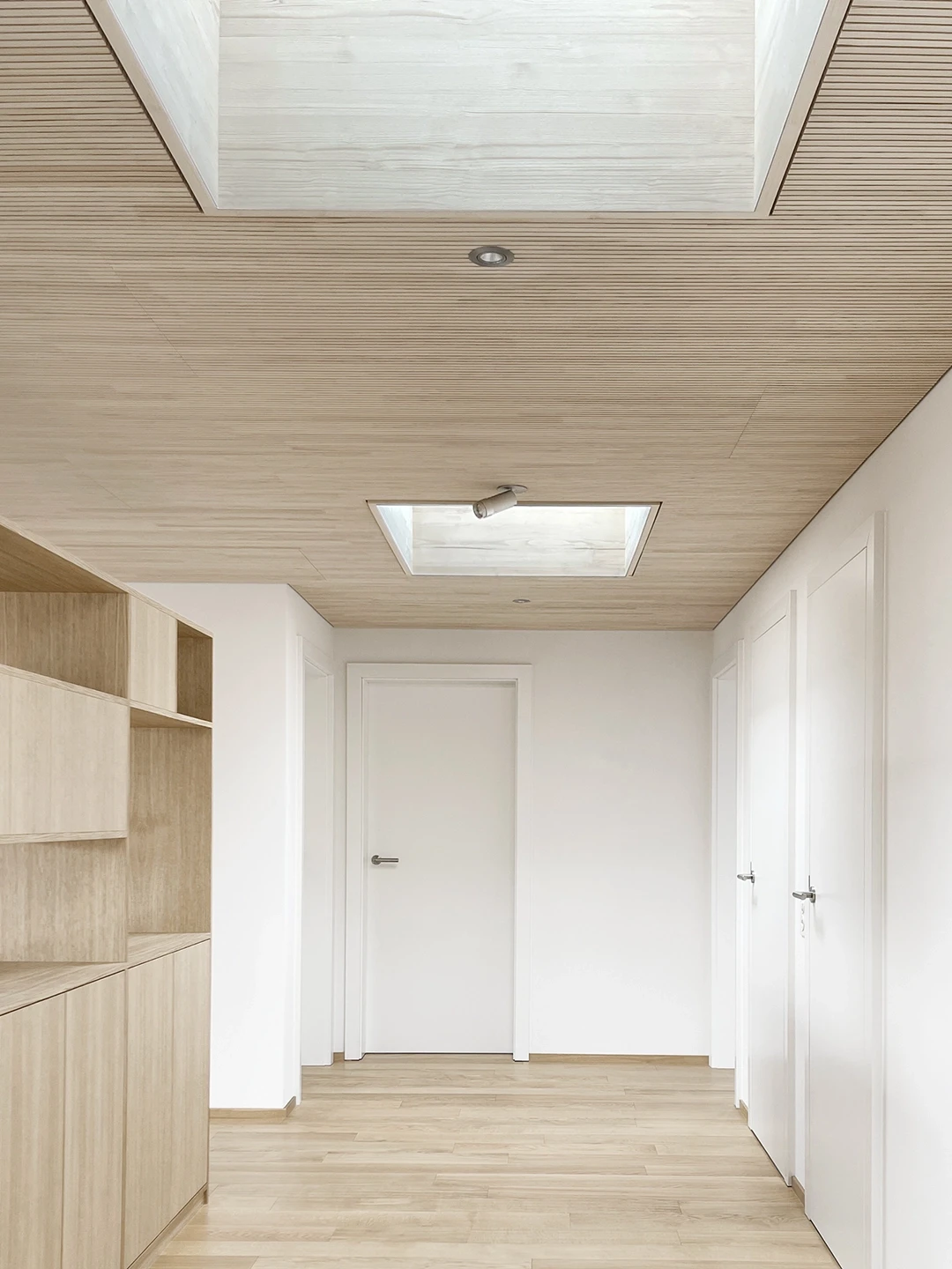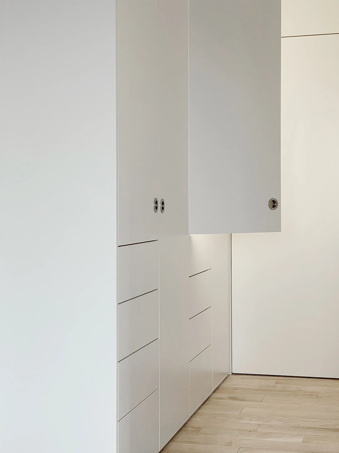 Bei der Aufstockung eines Mehrfamilienhauses in Hünenberg wurde eine 3.5-Zimmerwohnung als neues Zuhause für ein Seniorenpaar konzipiert. Die Gestaltung setzt auf warme Hölzer, feine Linien und sinnliche Grautöne. Ein Raumtrenner in heller Eiche zoniert den Wohnbereich und führt zum privaten Rückzugsort. Edelstahl-Armaturen und gezielte Lichtreflexe akzentuieren die ruhige Gesamtstimmung. Grundriss Materialkonzept Küche & Bäder Raumtrenner